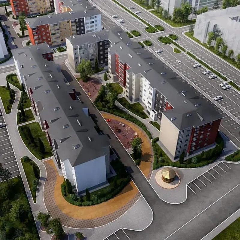 На территории построено 51 дом, на которых расположено 1120 квартир (от 43 до 135 квартир в зависимости от дома).