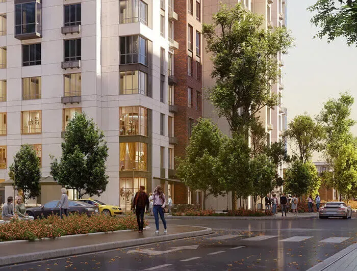 Фасад комплекса отделан клинкерным кирпичом и декоративными панелями, что придает зданию современный и элегантный вид. Для удобства жителей предусмотрены пассажирские лифты и наземный паркинг. Центральное отопление обеспечивает комфортное проживание в любое время года.