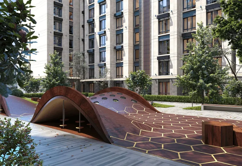 Комплекс состоит из 18 девятиэтажных домов, возводимых по монолитно-каркасной технологии. Фасады зданий облицовываются натуральным камнем и композитными панелями, что обеспечивает долговечность и современный внешний вид. Высота потолков в квартирах составляет 3,6 метра, а сами помещения сдаются в черновой отделке.